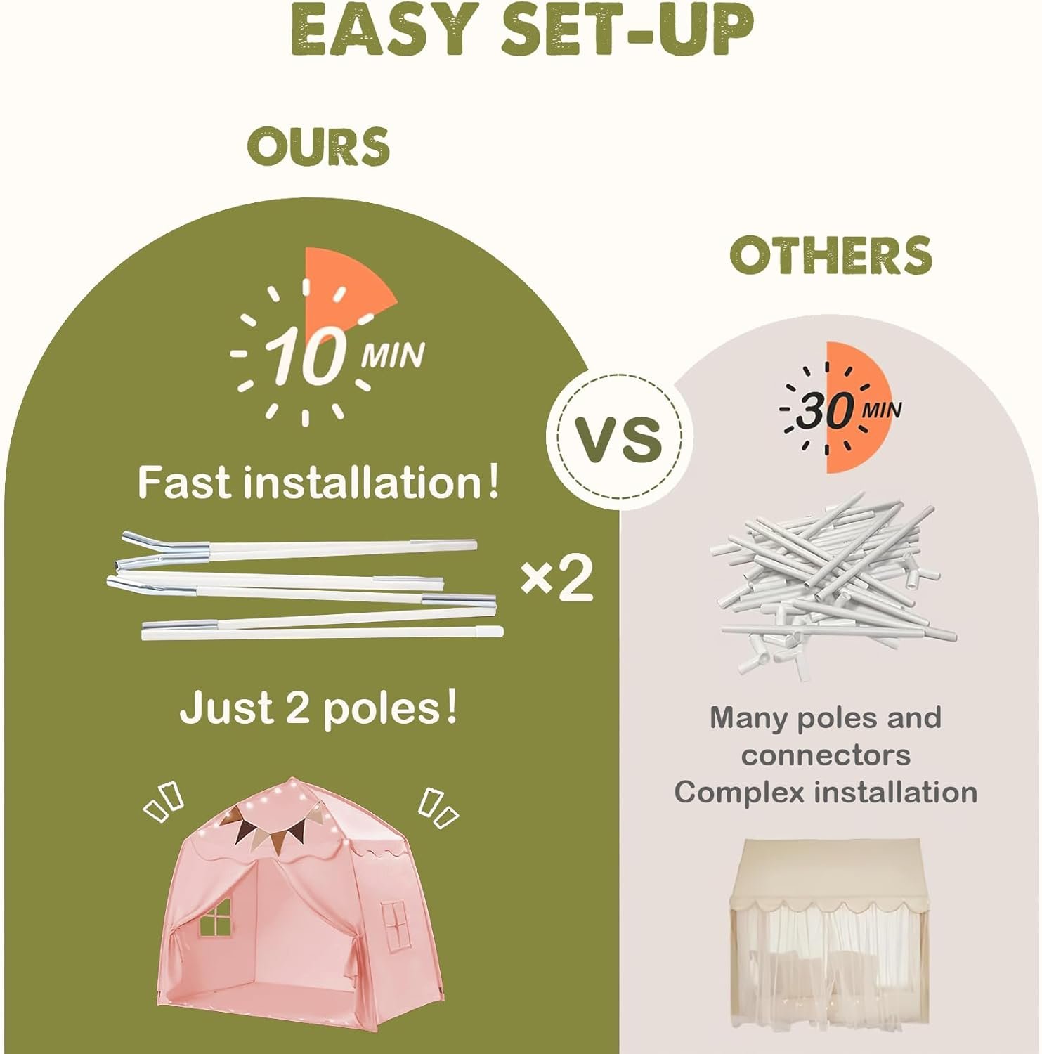 - EASY SET-UP & TAKE DOWN: This tent for kids is a breeze to install with its 2-step assembly, no tools needed – just two poles. Plus, the convenient disassembly and reassembly make it perfect for on-the-go fun. This kids tent is portable, foldable, and takes up minimal space. Whether it’s for gatherings, parks, daycares, picnics, hiking, or indoor play, children will adore it.