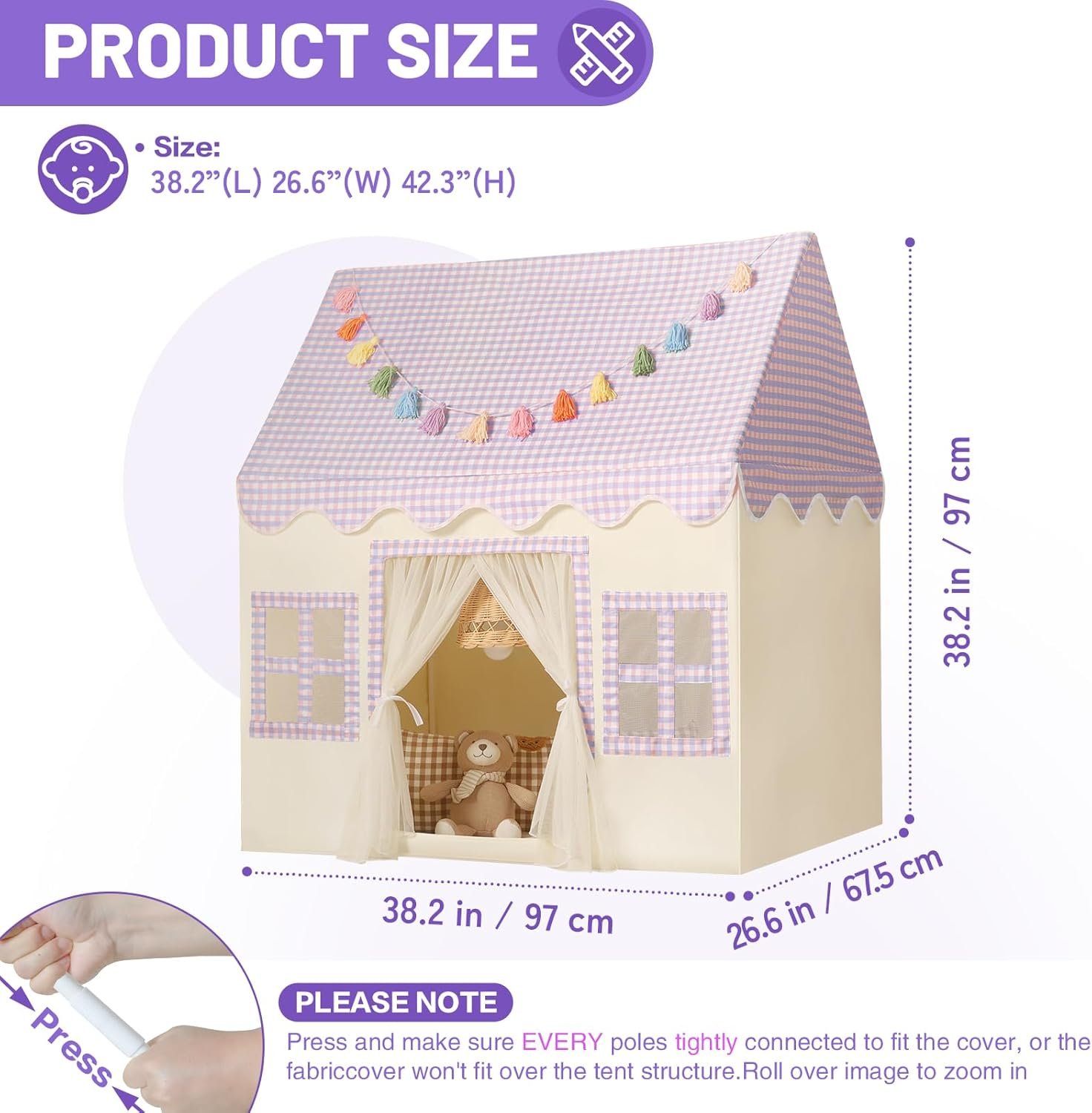 Kids Play Tent Indoor: Mat, Tassel Garland, Star Lights – Purple Checkered Girls Tent Playhouse for Toddlers Kids Toys for Boy Girl Birthday Gift