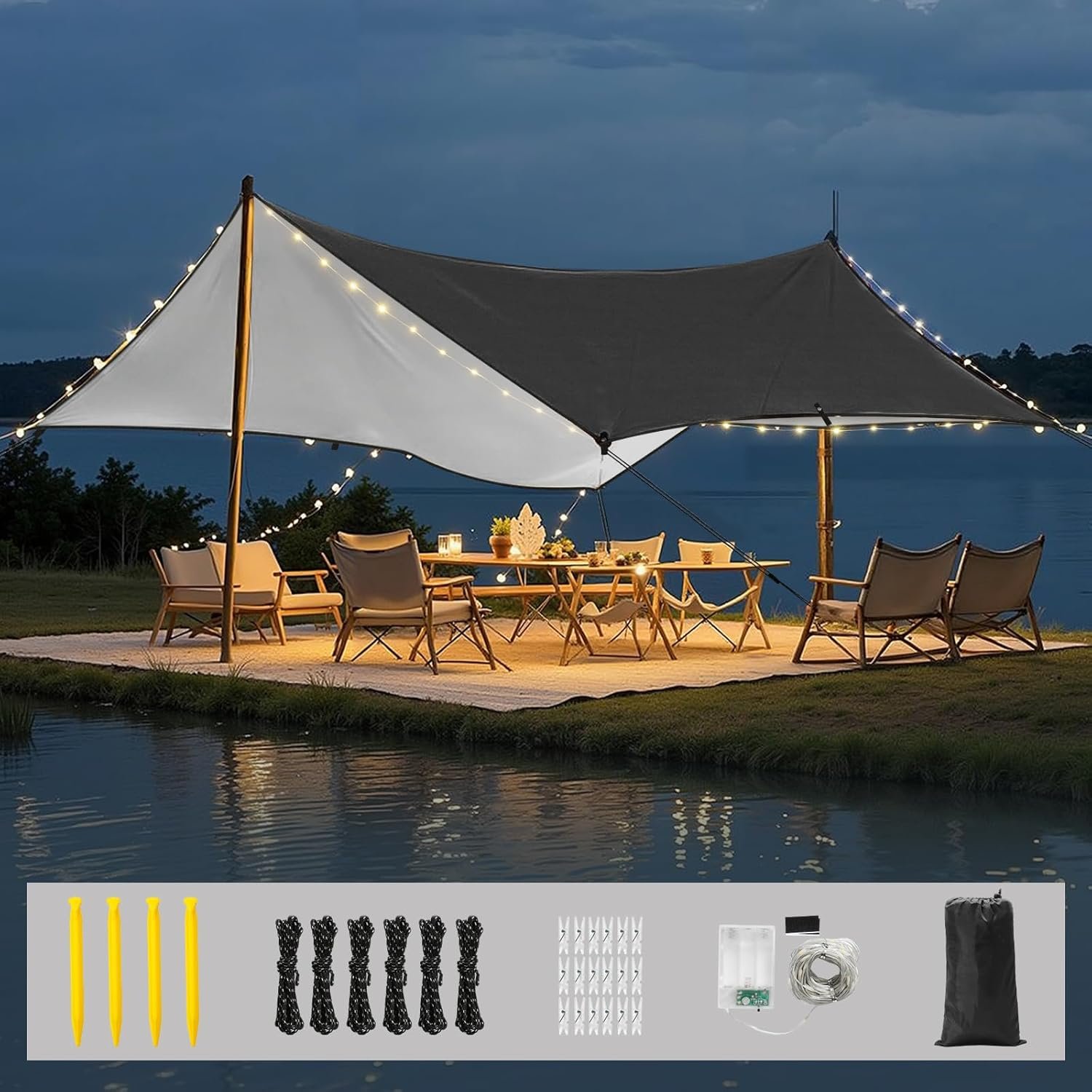 Waterproof Tent Tarp, 9.8 × 9.8 Ft Large Outdoor Shelter Cover with Light Strings, Lightweight Portable Tarp Shelter Rain Tarp Camping Canopy for Hiking Traveling Backpacking